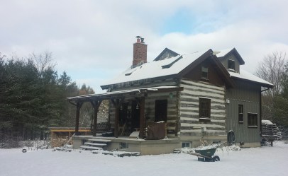 Fast forward to this Friday and here’s what things looked like as we got the first taste of winter. The overnight temp plummeted to -12 (!) as strong winds swirled through the pine trees creating an ocean-like sound of waves. Yes, I know, this blog is supposed to make you want to come stay here LOL. Well, if you like snow it will 🙂 Because when winter is grey and snowless (or grey yucky snow slush) in the GTA, there is a good chance it will be a pretty and pristine winter wonderland up here in the snow belt! And the Cordwood Cabin is the perfect cozy little spot to snug down with the woodstove on and a book, a glass of wine or pot of tea, and a view of the snowy forest outside the windows in every direction!