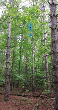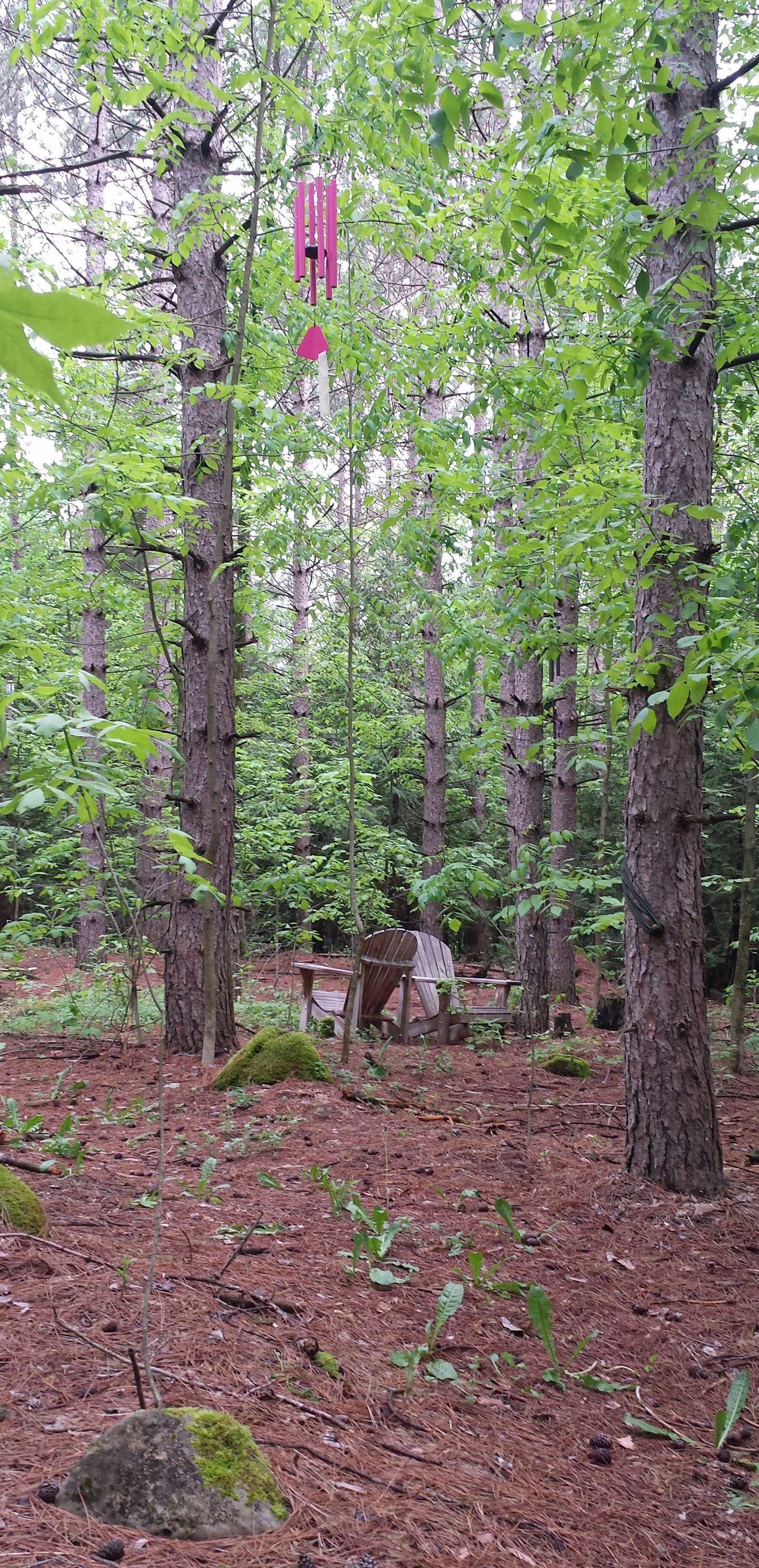Out in the middle of the Red Pines area I’ve fashioned a set-up to suspend wind chimes between trees. Don’t ask me how I got up so high… as I said to my mother who also asked, “you don’t want to know.” 😉 The suspension height is adjustable and also permits chimes to be switched around easily in order to adjust to different breezes and create an ever-changing variety of tone locations.