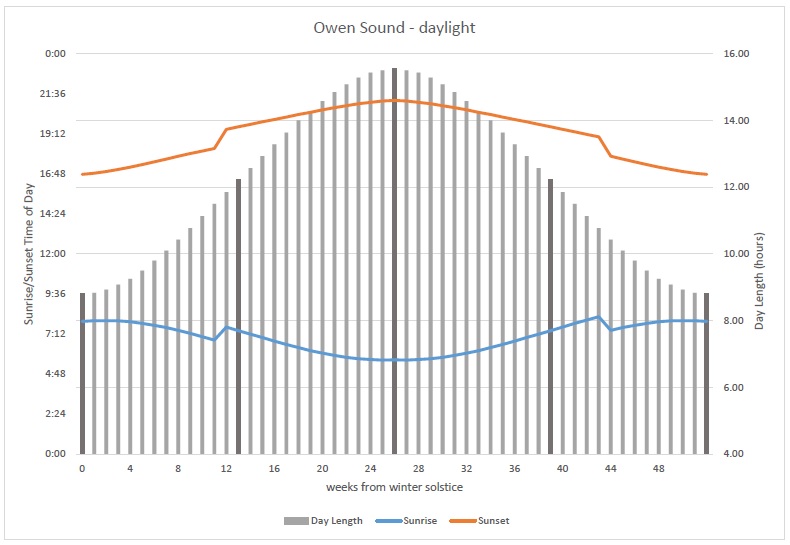 Today, Nov 23rd, we are 4 weeks from winter Solstice and moving into the darkest period of the solar year (see graph of daylight hours). It would be easy for me to grumble this time of year. But, really, I feel immense gratitude for how I can live here and all that I have been able to do with the free renewable energy I collect with solar panels.