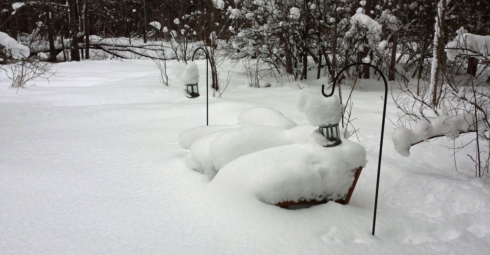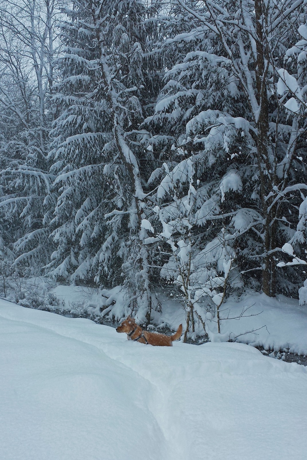 The yoga instructor in me would like to point out that, in addition to being a peaceful way to gracefully move through winter landscape, snowshoeing is great for the glute muscles! A fact not lost on the resident pooch, who has been getting a great workout as she variously bounds over and plows through the fluffy depths. Snowshoeing doesn’t require any particular skill. Basically, just walk with your feet a bit wider apart than usual. And perhaps a bit slower than usual–which is a good thing, to slow down.