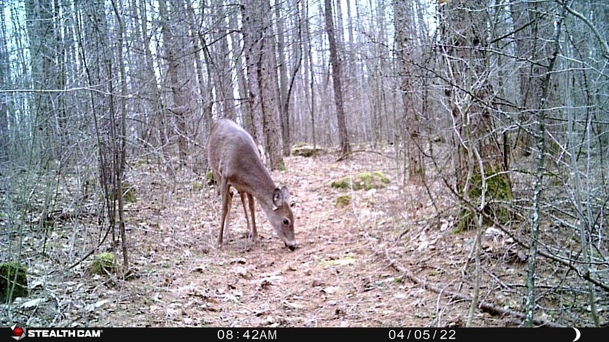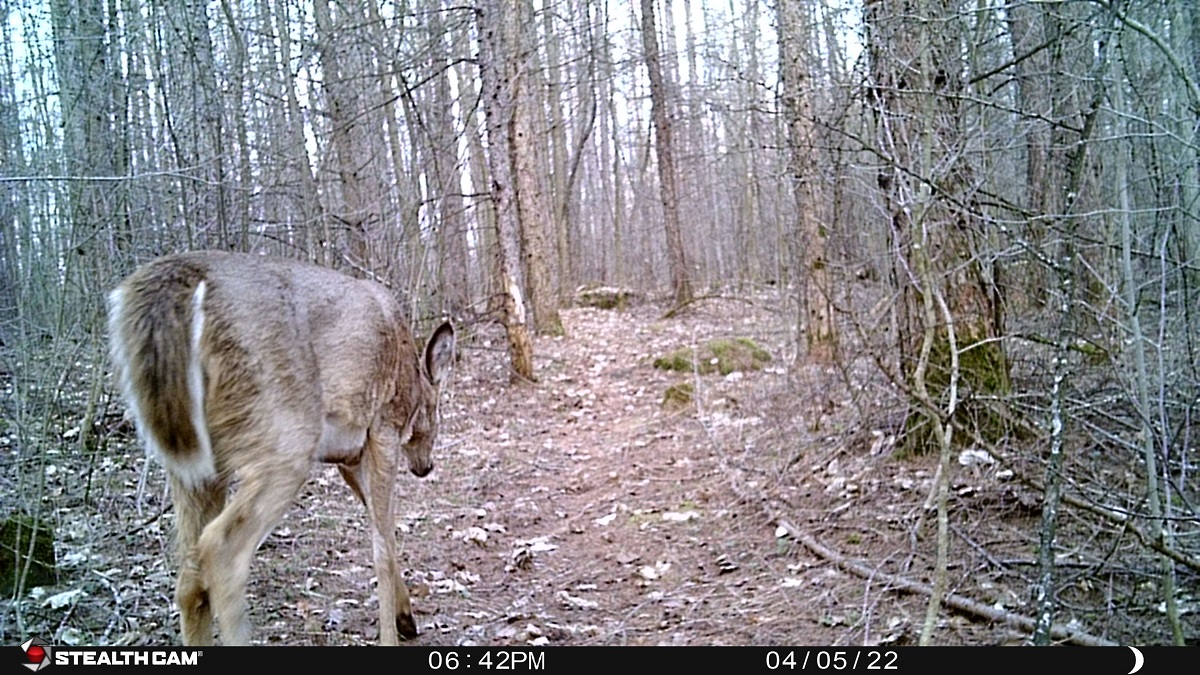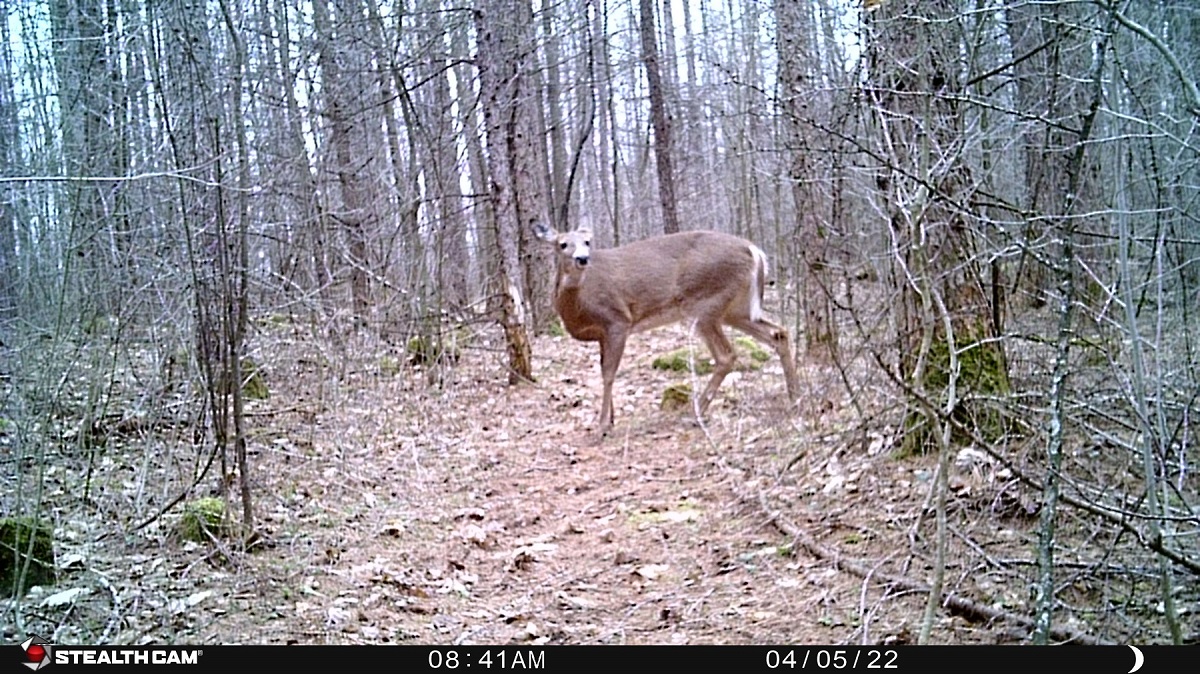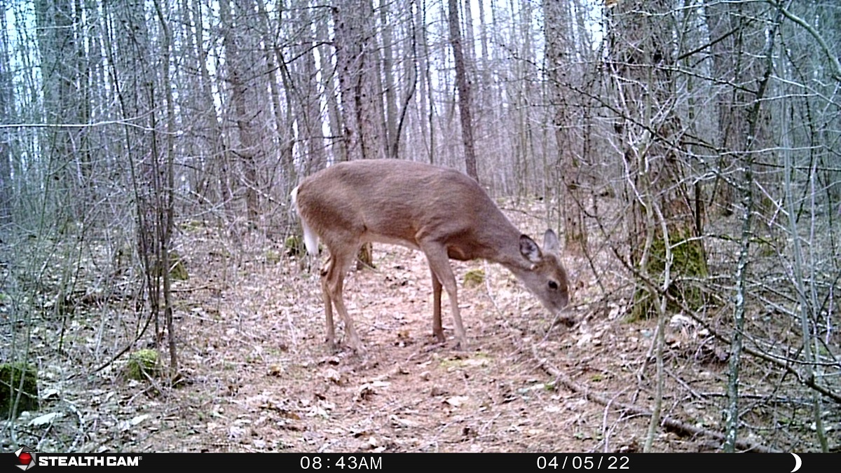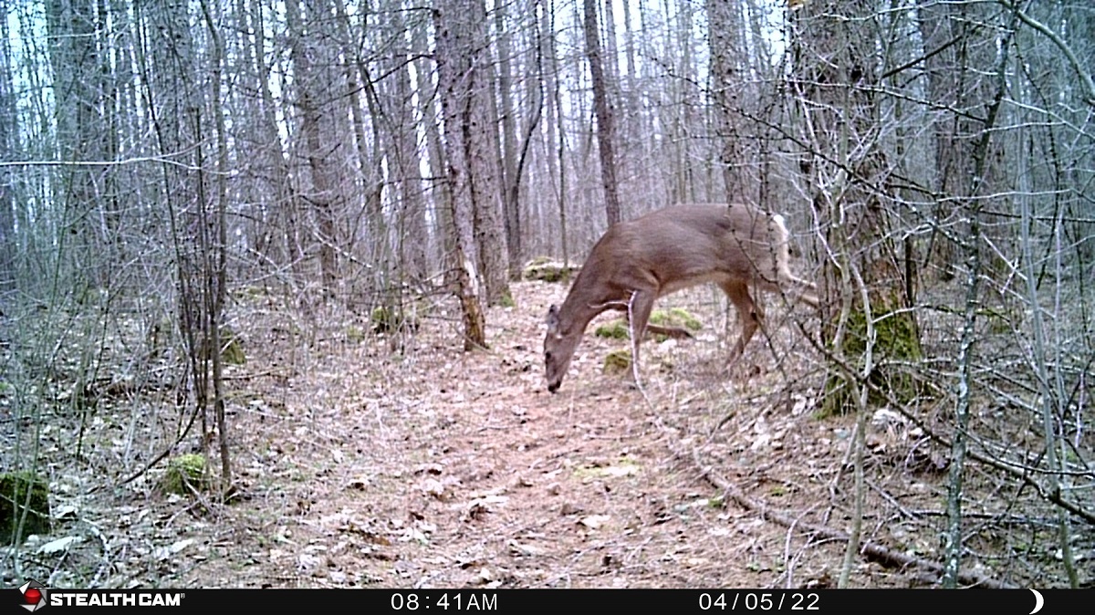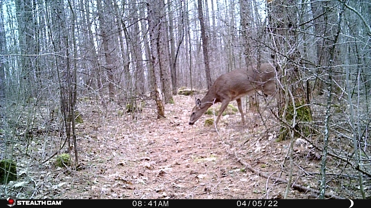 [APR2002] I could hear the coyotes had been quite active nearby a few evenings in a row so I set out the TrailCam in the area I guessed they had been to try to catch some images. When I unloaded the camera card a week later, no luck on coyotes but I got loads of photos of a lovely young deer. It clearly liked this spot since it was browsing twigs long enough one morning for the camera to capture just about every possible angle, and then returned to the same location around supper time that same day! Hopefully those wiley coyotes don’t figure out deer’s pattern.