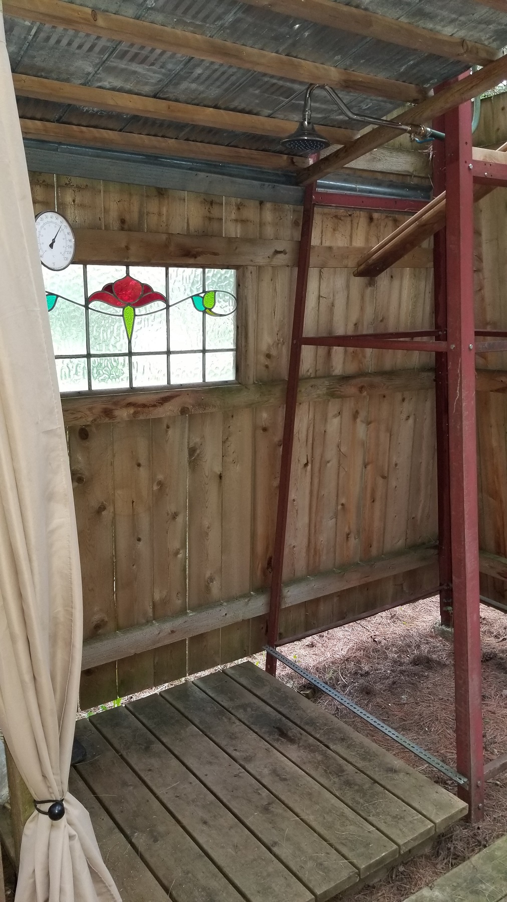 To accommodate the bucket placement , I moved the shower head into the more enclosed area of the shelter outside the sauna. This will be no doubt be appreciated by guests who might prefer being less exposed to the breeze (or the forest LOL) when using it either as a sauna rinse or a shower in itself. As a bonus, the move reoriented the angle of the showerhead feeder pipe and improved water flow.