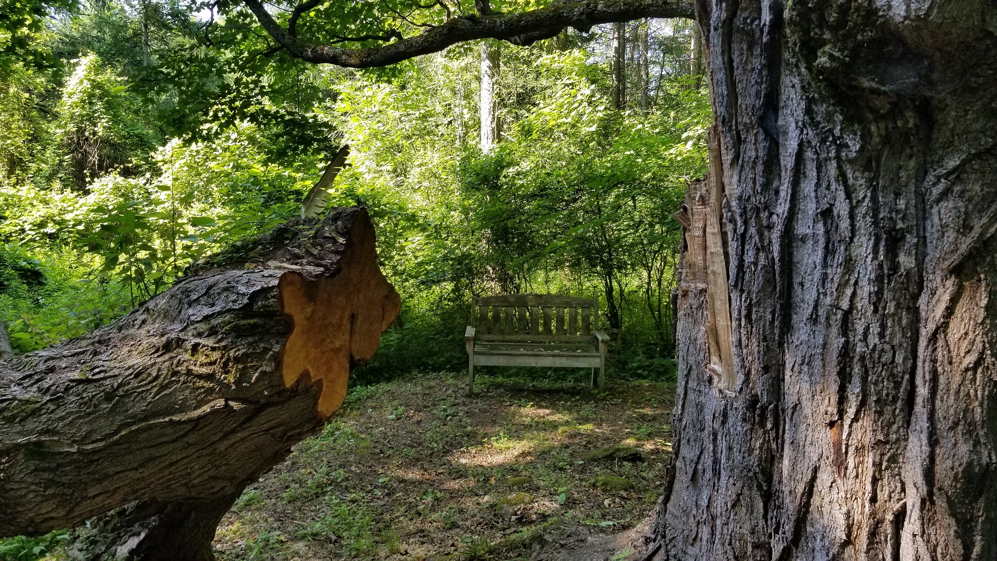 While I did want to leave the big arm where it fell, I did saw out a couple feet of it, where it had hinged from the trunk, so that Spirit Tree can once again be encircled and hugged. Though you will need at least three people to hold hands and fully surround this glorious tree. On the cut area of the branch, I have oiled with an eco-friendly blend to preserve the grain and pattern. I invite you to explore this on your next visit. Spend some time with Spirit Tree and see what wisdom she has to share with you.