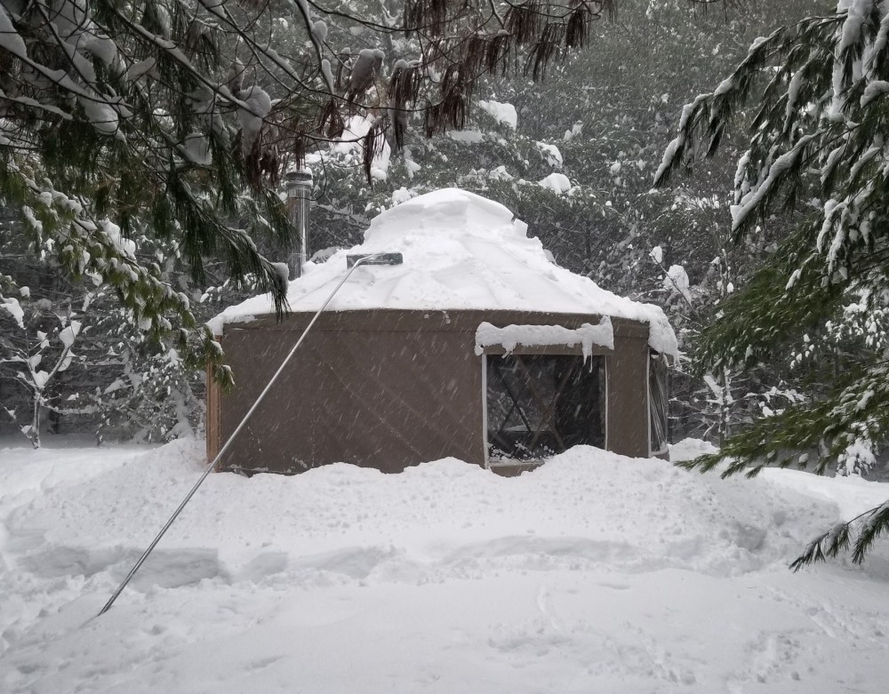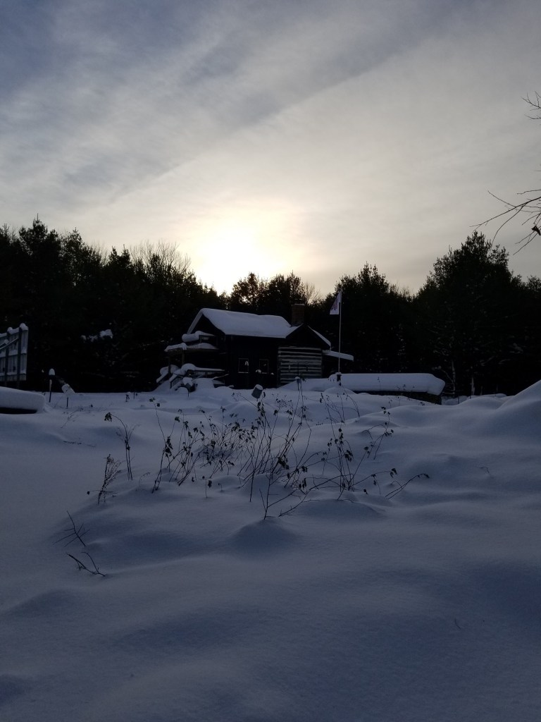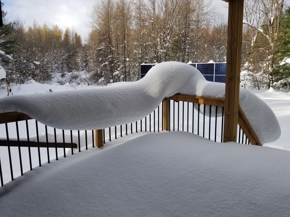 Here at Off Grid Retreat, southwest of Owen Sound, I stabbed a metre stick in the ground a few times once the snow had tapered off and it averaged out around 60 cm, or 2 feet. Now that is the depth of settled snow on the ground; the actual fallen amount would be a bit higher but I don’t know enough how to guess at that. Half an hour up the road in Wiarton (home of Wiarton Willie, the famous albino weather-foretelling rodent), the squalls lingered for longer on day 3 and they officially recorded 120+ cm total fallen (click for related news item).