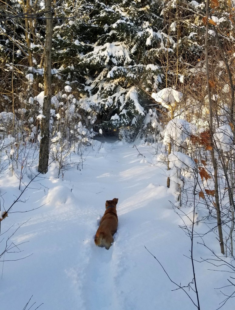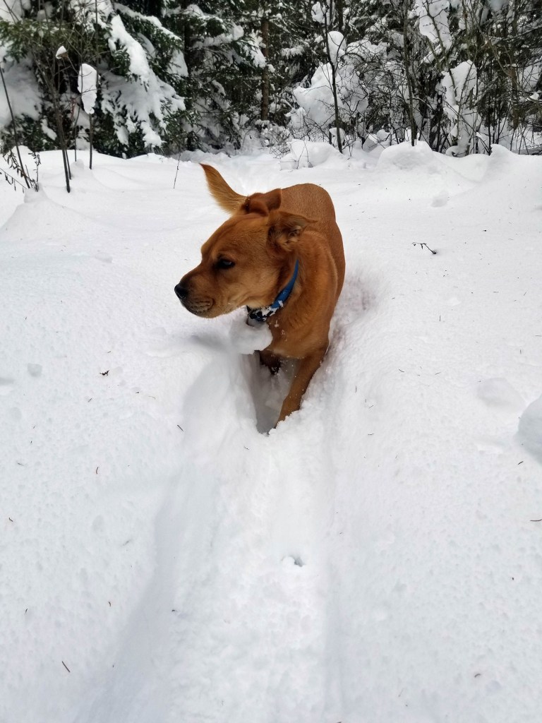 When snow is this deep Luna either bounds over or plows through.