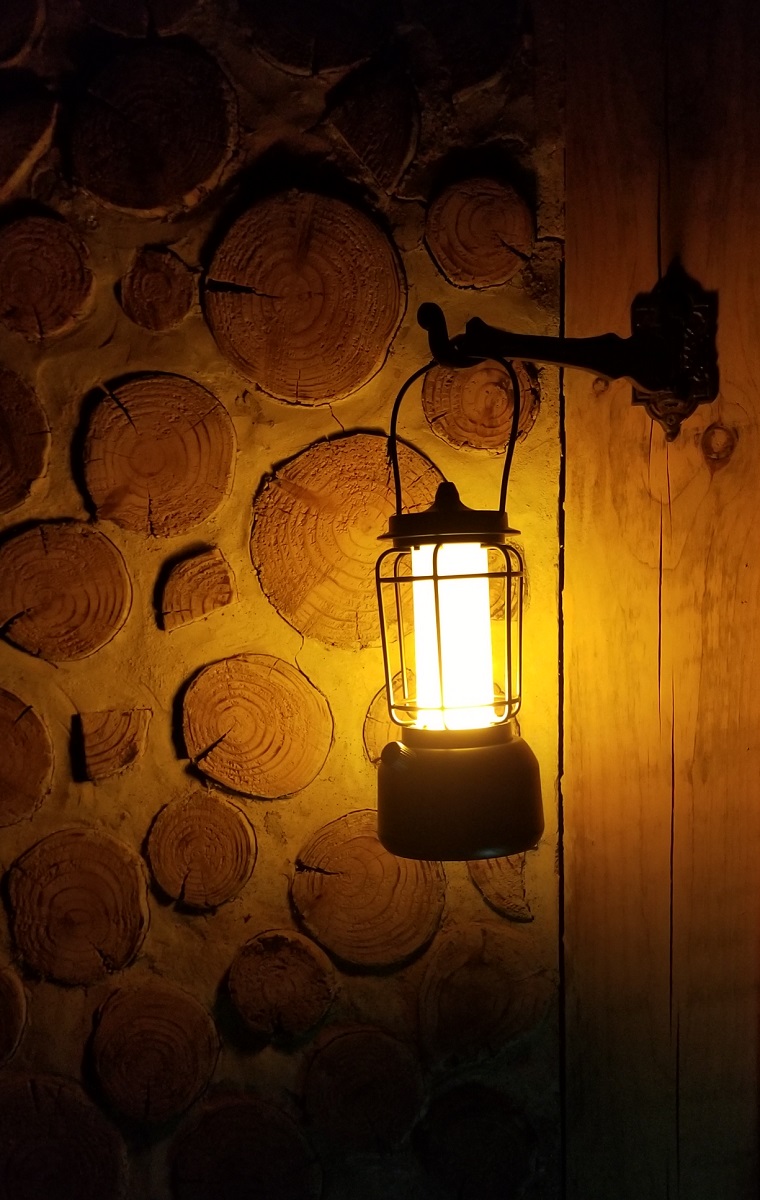 The ceiling light is useful but not much for ambience, so there’s also fairly lights along the beam overhead the bed (nice & gentle for dozing off) as well as several lanterns which look like old-school metal camping lanterns but actually run on batteries and have dimmable LEDs as the light source. After years of use, the knobs on the metal lanterns have been getting touchy so I’ve had my eyes open for replacements. Plus I was never a big fan of the “cool white” light they gave off.