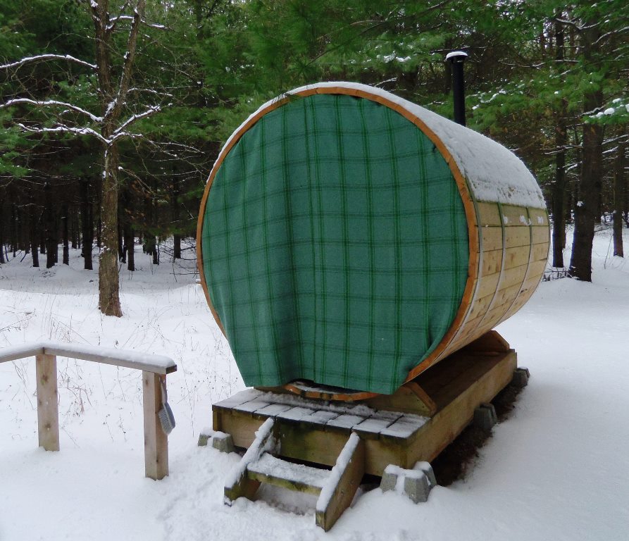 In winter the outdoor shower is not functional so you can use buckets of water for the cool-off, or if you’re brave try rolling in the snow like the Finns do! You will know you have warmed enough when the cool-off is fresh & bracing but not shocking 🙂 In winter time, I hang wool blanket curtains in front of the porch to form a cozy buffer between the inner and outer worlds!